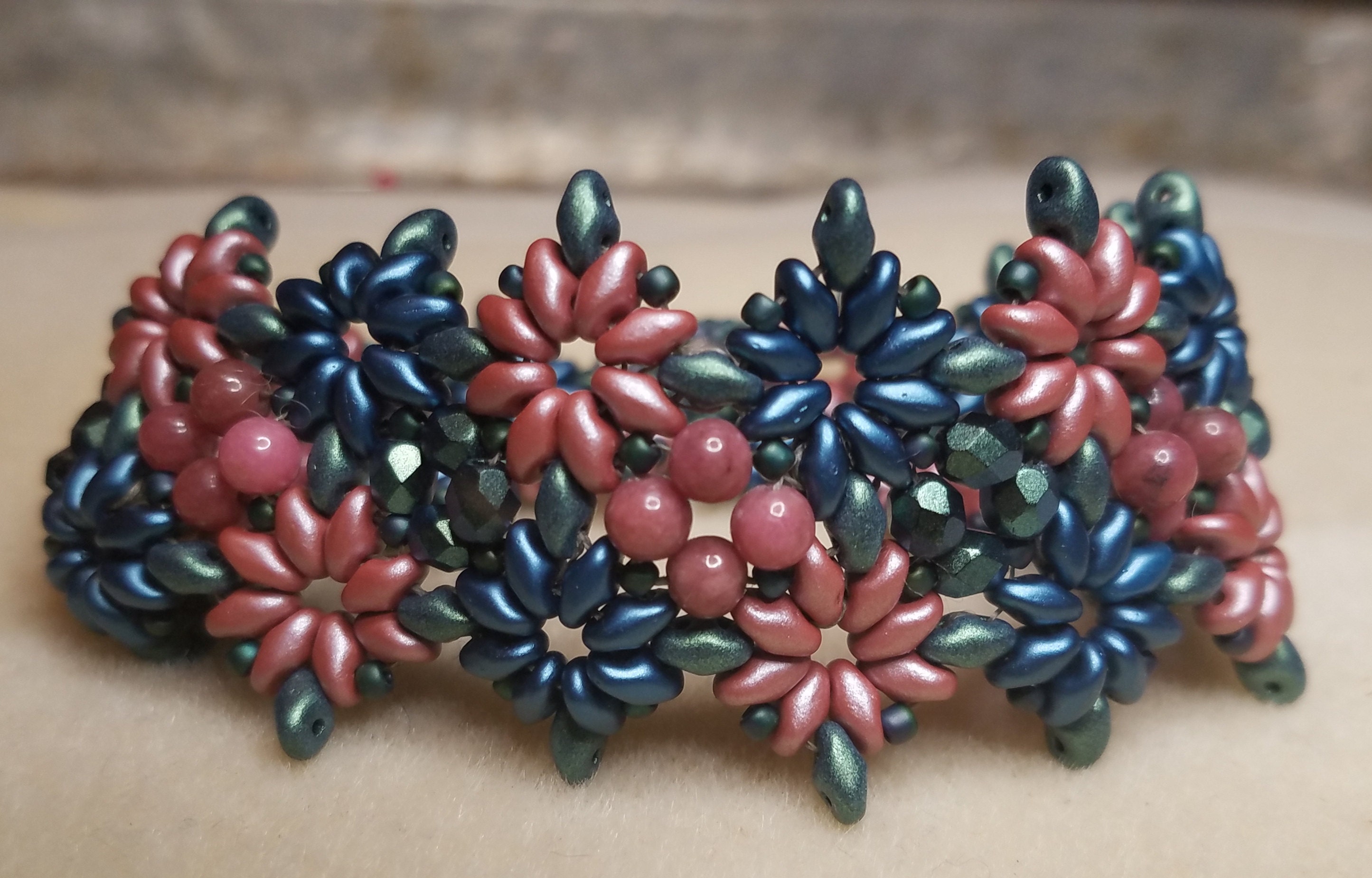You’ll need SuperDuo beads, size 11 and 15 seed beads, and a button bead to complete your bracelet.
